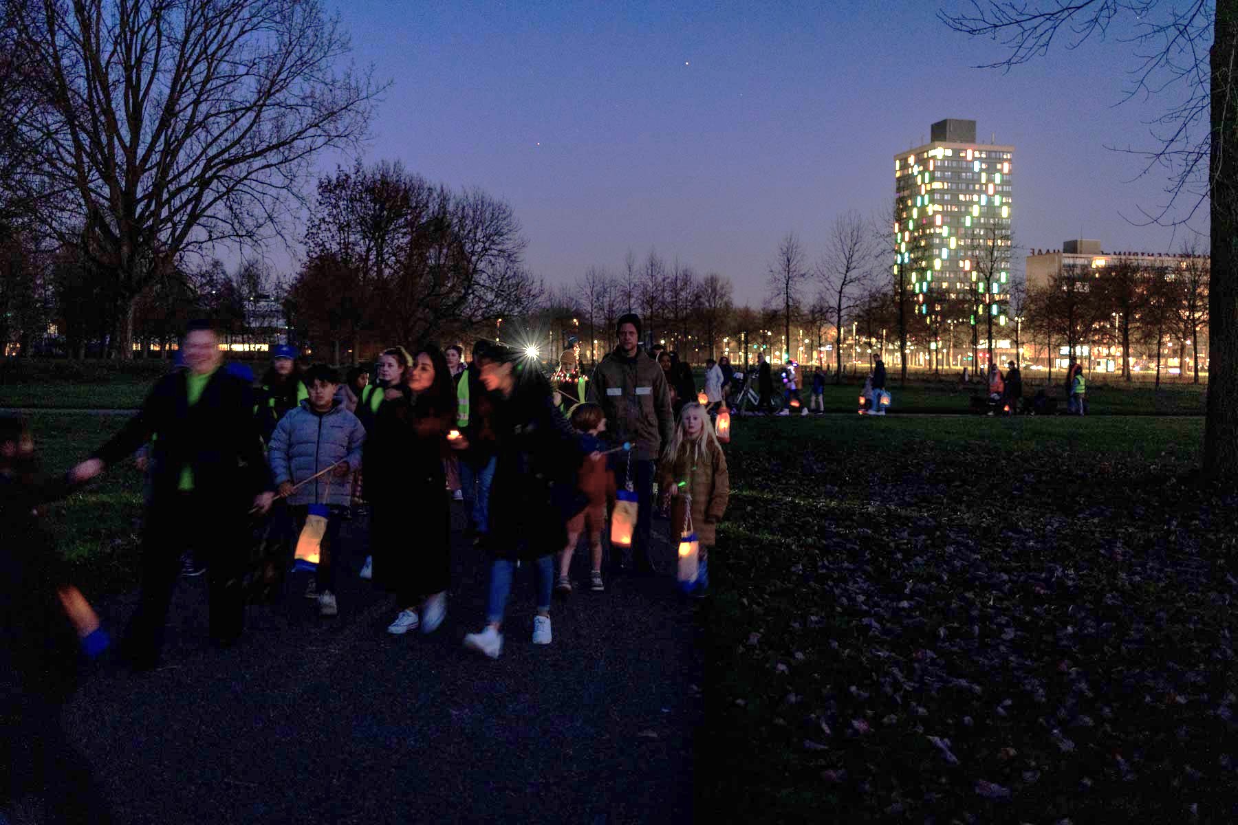 Bij de start van de lichtjesparade zijn de kinderen uitgelaten en tonen ze trots hun lampionnen. Maar als ze even later het verlichte winkelcentrum achter zich hebben gelaten en in het donkere park Presikhaaf lopen zijn ze muisstil en serieus. In het pikkedonker herkennen ze nauwelijks hun anders zo vertrouwde omgeving. “Hé daar ligt de speeltuin!”, roept een jongetje verrast. Ze zijn pas op de helft. De stoet gaat verder, naar het hoofdkwartier van Collectief Koppig, waar ze afsluiten met een drankje, gezonde hapjes en workshops.
