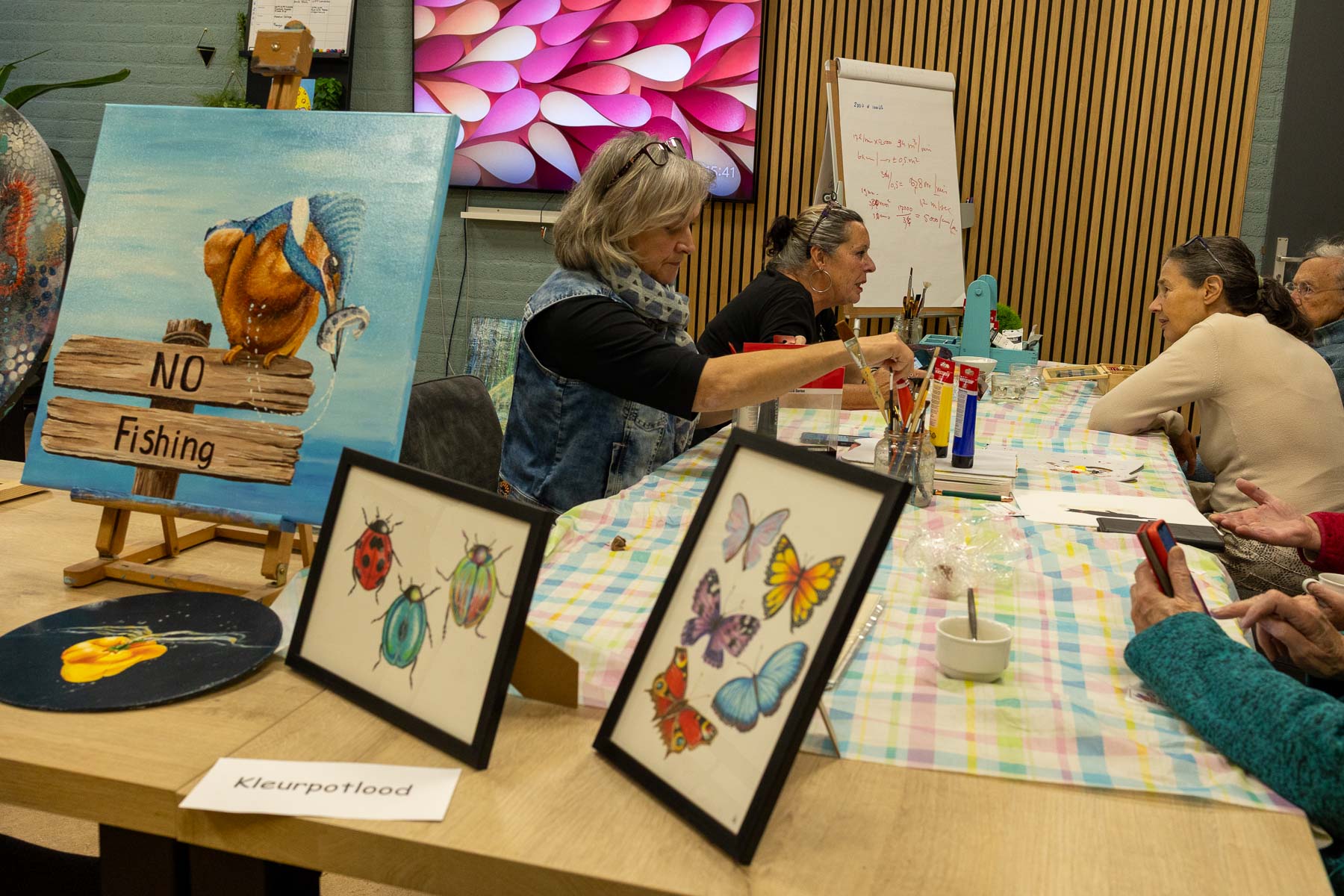 Tijdens een van de bijeenkomsten is de Huissense kunstenaar Louise de Haardt te gast. Omringd door haar eigen schilderwerken laat zij zien hoe zij werkt met acrylverf. Het publiek stelt vol interesse vragen, en al snel grijpen sommige deelnemers zelf naar kwast en verf om onder haar begeleiding aan de slag te gaan.